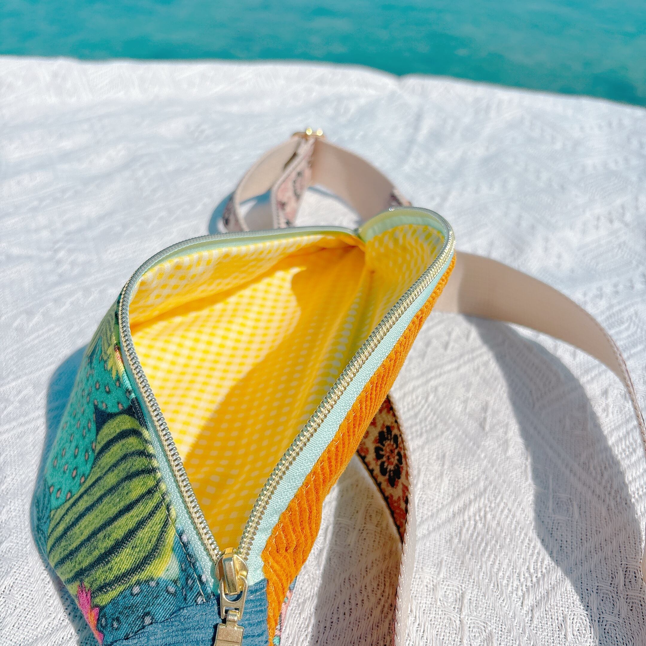 色鮮やかな生地を組み合わせて仕立てた、