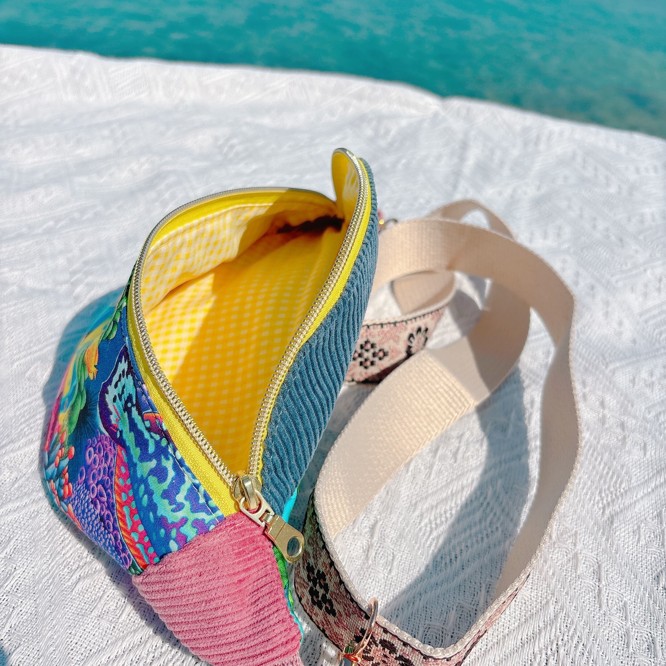 色鮮やかな生地を組み合わせて仕立てた、