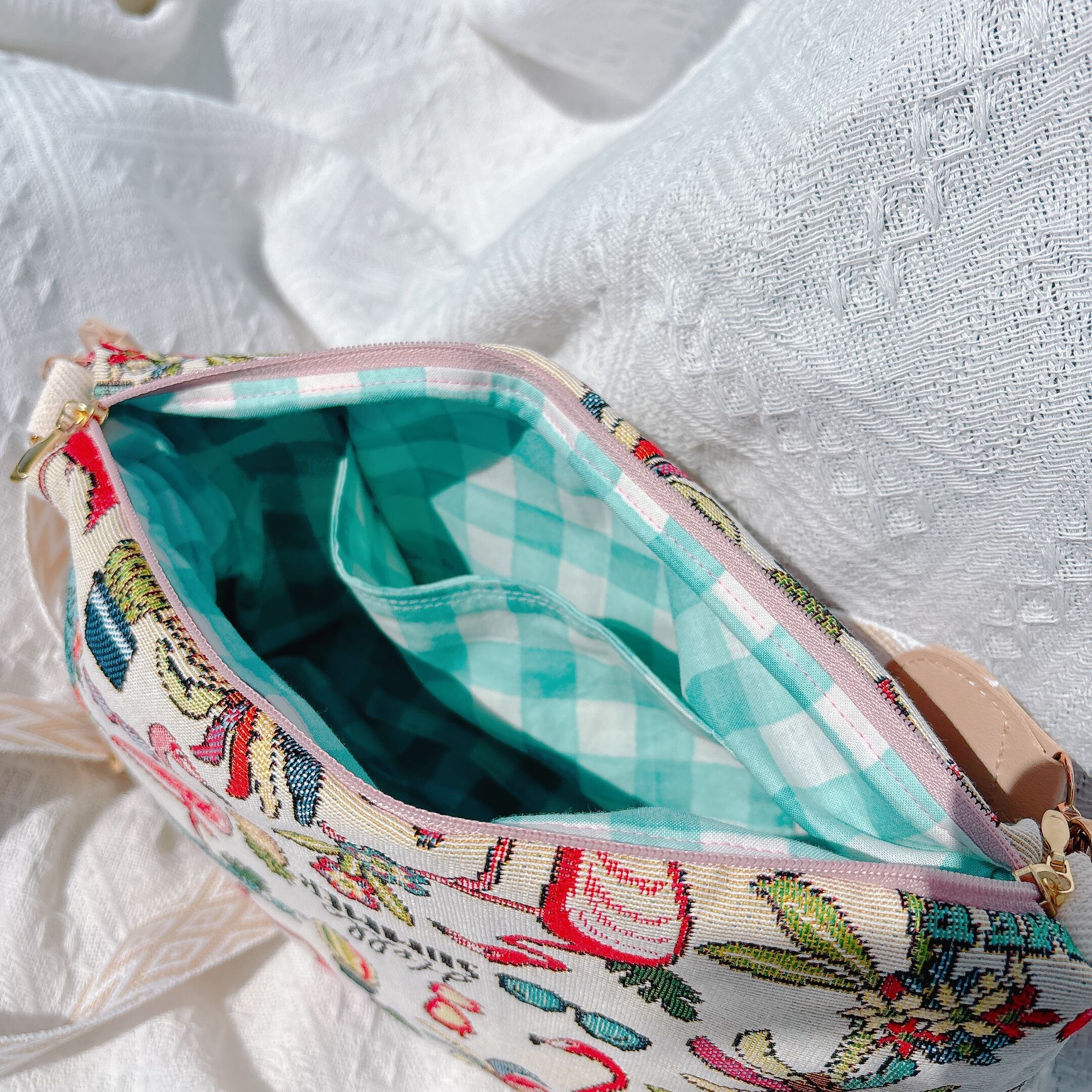 印象的なフラミンゴ柄のジャガード生地を使用し、可愛さの中にしっかりとした高級感をプラスしました。